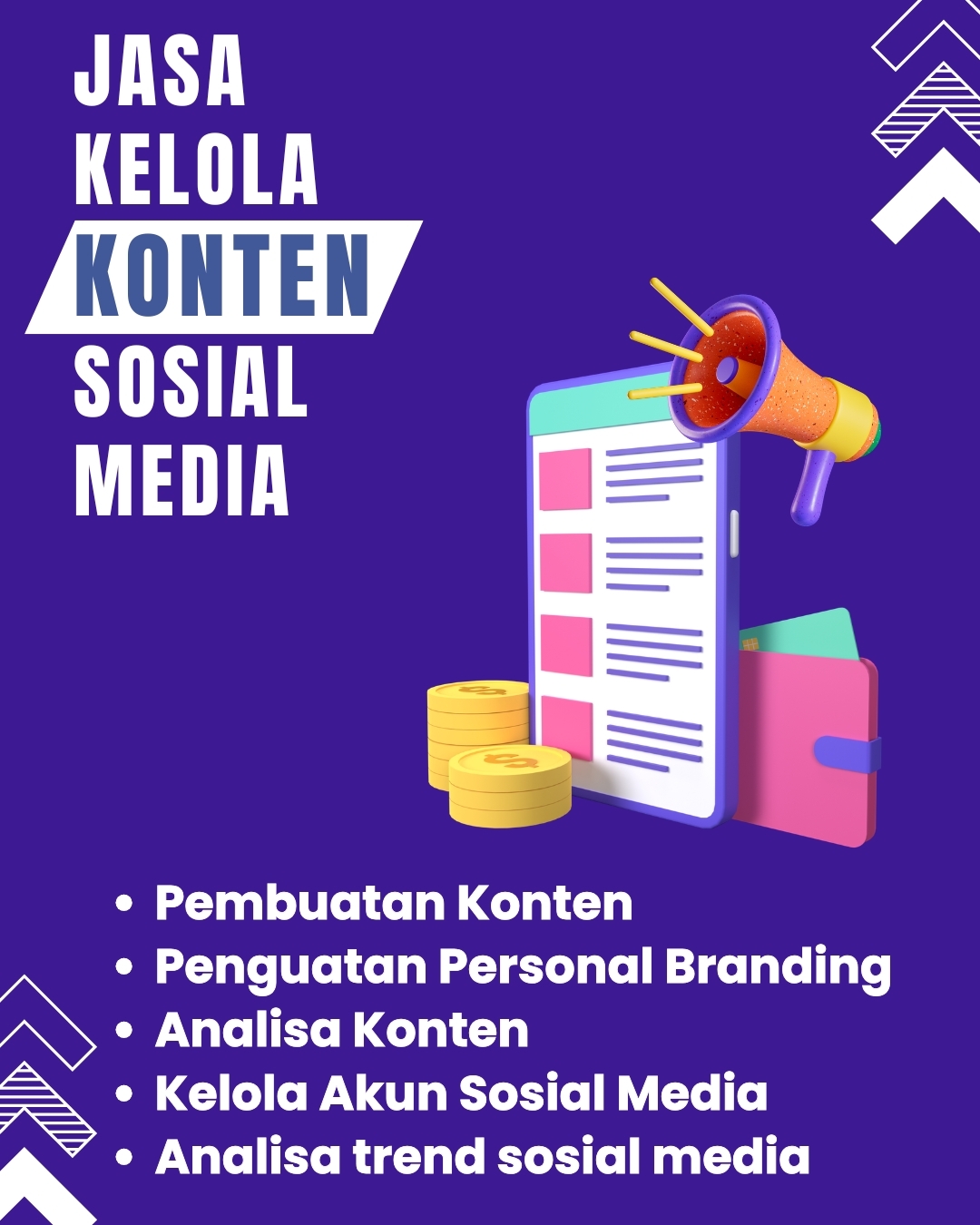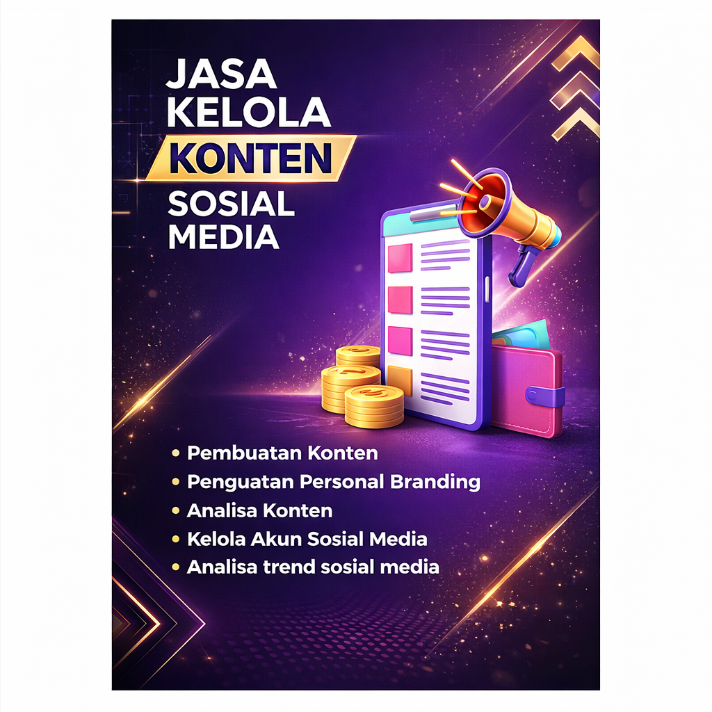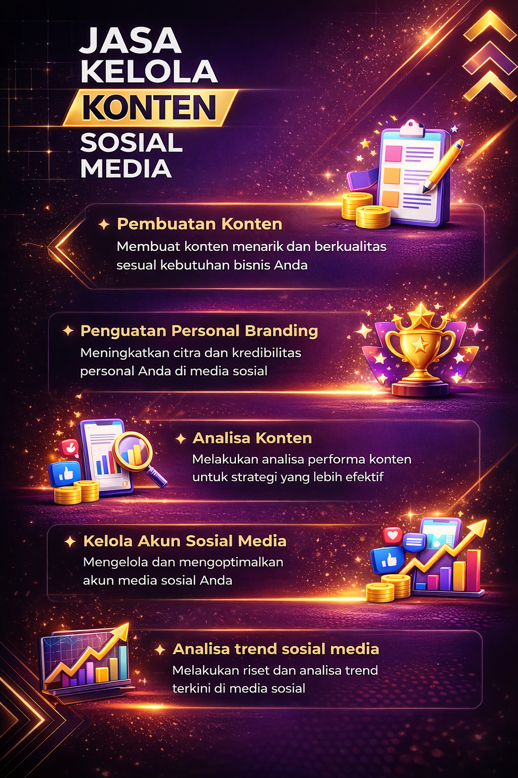 Tingkatkan performa digital bisnis Anda dengan layanan Jasa Kelola Konten Sosial Media profesional dan premium. Layanan ini dirancang untuk membantu bisnis, personal brand, atau organisasi Anda hadir secara efektif di platform media sosial melalui strategi yang terukur dan konten berkualitas tinggi. Infografis ini menampilkan lima nilai utama layanan secara jelas: – Membuat konten menarik, relevan, dan berkualitas sesuai kebutuhan bisnis, meningkatkan engagement dan awareness. Penguatan Personal Branding – Meningkatkan citra dan kredibilitas Anda di media sosial, membangun kepercayaan audiens. Analisa Konten – Memantau performa konten untuk strategi yang lebih efektif dan berbasis data. Kelola Akun Sosial Media – Mengelola dan mengoptimalkan akun media sosial agar lebih profesional dan konsisten. Analisa Trend Sosial Media – Melakukan riset dan analisis tren terkini untuk memastikan strategi konten selalu up-to-date. Memberikan Layanan Jasa Kelola Konten Sosial Media dalam kurun waktu per 1 bulan ( per 1 paket)