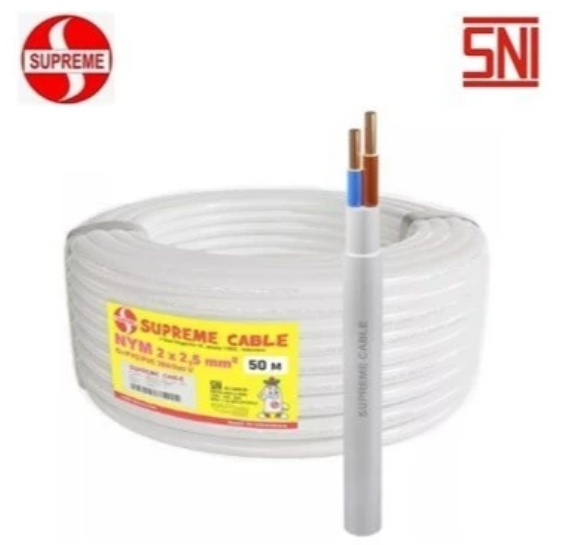 Kabel Supreme NYM 2 x 2.5 mm² adalah kabel listrik dengan dua inti konduktor tembaga, masing-masing berukuran 2.5 mm², dan dilapisi dengan isolasi serta pelindung dari PVC. Kabel ini dirancang untuk aplikasi distribusi daya dan sistem kontrol yang memerlukan dua jalur konduktor dalam satu kabel. Berikut adalah penjelasan rinci mengenai kabel ini: 1. Deskripsi Umum Jenis Kabel: Kabel Supreme NYM 2 x 2.5 mm² adalah kabel dengan dua inti konduktor tembaga yang masing-masing berukuran 2.5 mm². Ini menunjukkan bahwa kabel ini memiliki dua jalur konduktor di dalam satu kabel, yang ideal untuk aplikasi yang membutuhkan distribusi daya atau kontrol dengan dua jalur. Konstruksi: 2 x 2.5 mm²: Menunjukkan bahwa kabel ini memiliki dua inti konduktor, masing-masing berukuran 2.5 mm². Kabel ini sering digunakan dalam instalasi yang memerlukan dua jalur konduktor untuk distribusi daya atau kontrol. NYM: Kode ini menunjukkan jenis isolasi dan pelindung kabel. NYM adalah singkatan dari: N: Non-armoured (tanpa pelindung logam tambahan) Y: PVC Insulated (isolasi PVC) M: PVC Sheathed (pelindung PVC) 2. Spesifikasi Teknis Konduktor: Terbuat dari tembaga dengan ukuran penampang 2.5 mm² untuk setiap inti. Tembaga digunakan karena konduktivitasnya yang tinggi, memungkinkan kabel ini menghantarkan arus listrik dengan efisien. Isolasi: Kabel ini dilapisi dengan isolasi PVC di sekitar setiap inti konduktor. Isolasi PVC Pelindung: Kabel ini juga dilapisi dengan pelindung PVC di luar, yang memberikan perlindungan tambahan terhadap kerusakan fisik dan kondisi lingkungan eksternal. 3. Keuntungan Kemampuan Menghantarkan Arus Menengah: Dengan ukuran penampang 2.5 mm², kabel ini dapat menangani arus listrik menengah, ideal untuk berbagai aplikasi distribusi daya dan kontrol. Ketahanan: Isolasi dan pelindung PVC memberikan perlindungan yang baik terhadap kelembapan, kerusakan mekanis, dan bahan kimia ringan. Ini juga memastikan umur pakai kabel yang lebih lama. Fleksibilitas: Kabel ini cukup fleksibel dan mudah dipasang dalam berbagai jalur atau area, termasuk dalam pipa conduit, tray kabel, atau langsung di permukaan.