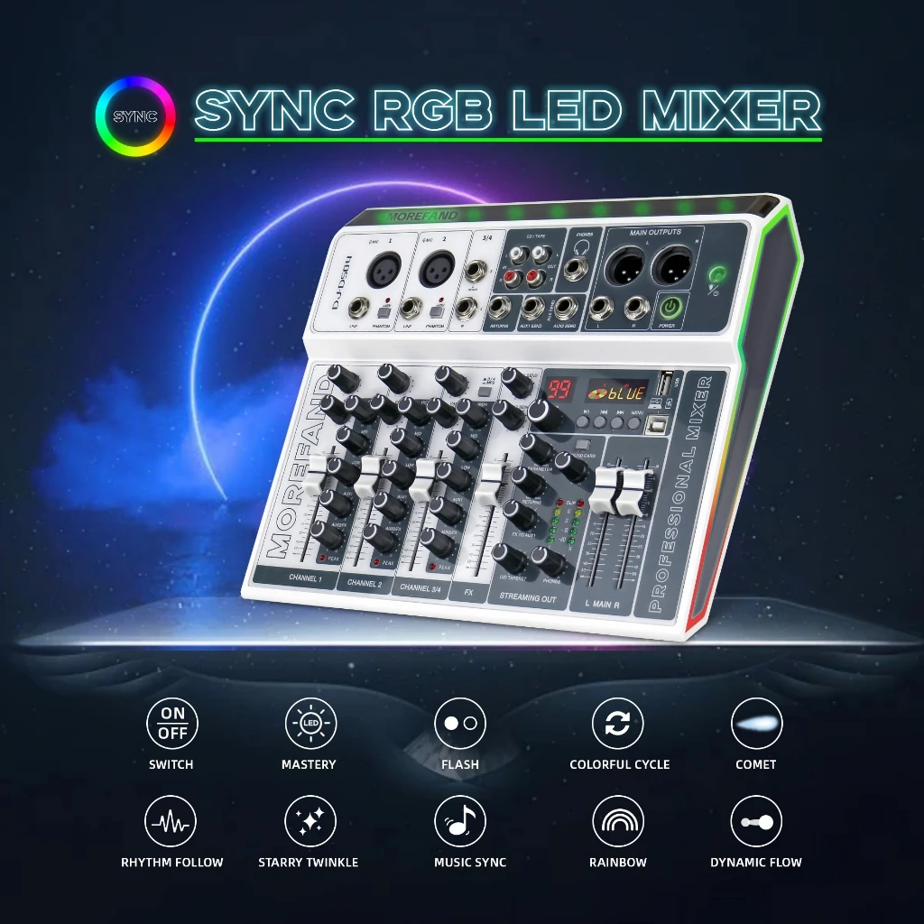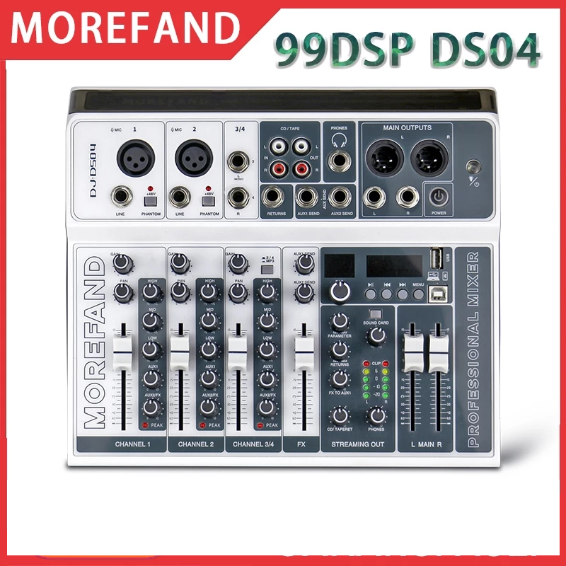 7 saluran input, dengan +48V phantom power diperlukan untuk mikrofon kondensor dan titik penyisipan untuk sinyal eksternal. Setiap saluran memiliki penyesuaian gain, equalizer tiga-bands, sinyal kiriman saluran tambahan, sinyal kiriman efek, penyesuaian pan, dan indikasi distorsi. 1 pengiriman aux pre-fader dan 1 pengiriman efek post-fader per saluran. Potensiometer push-pull 60mm presisi tinggi dan tahan lama untuk penyesuaian level yang tepat dan halus. Indikator level stereo 6-segmen untuk indikasi level sinyal yang akurat. Efek reverb bawaan dengan penyesuaian parameter independen. Pemutar disk USB bawaan dengan tampilan digital. Antarmuka output perekaman, antarmuka output stereo seimbang. Desain catu daya switching eksternal dengan efisiensi tinggi dan penghematan energi, sepenuhnya menghilangkan interferensi frekuensi tinggi. Sirkuit pemantauan headphone berkinerja tinggi, dapat beroperasi secara independen. Memantau setiap saluran input, saluran output campuran, dan saluran efek. Penampilan yang indah dengan warna cerah, cocok untuk berbagai pertunjukan langsung dan aplikasi studio radio/televisi.