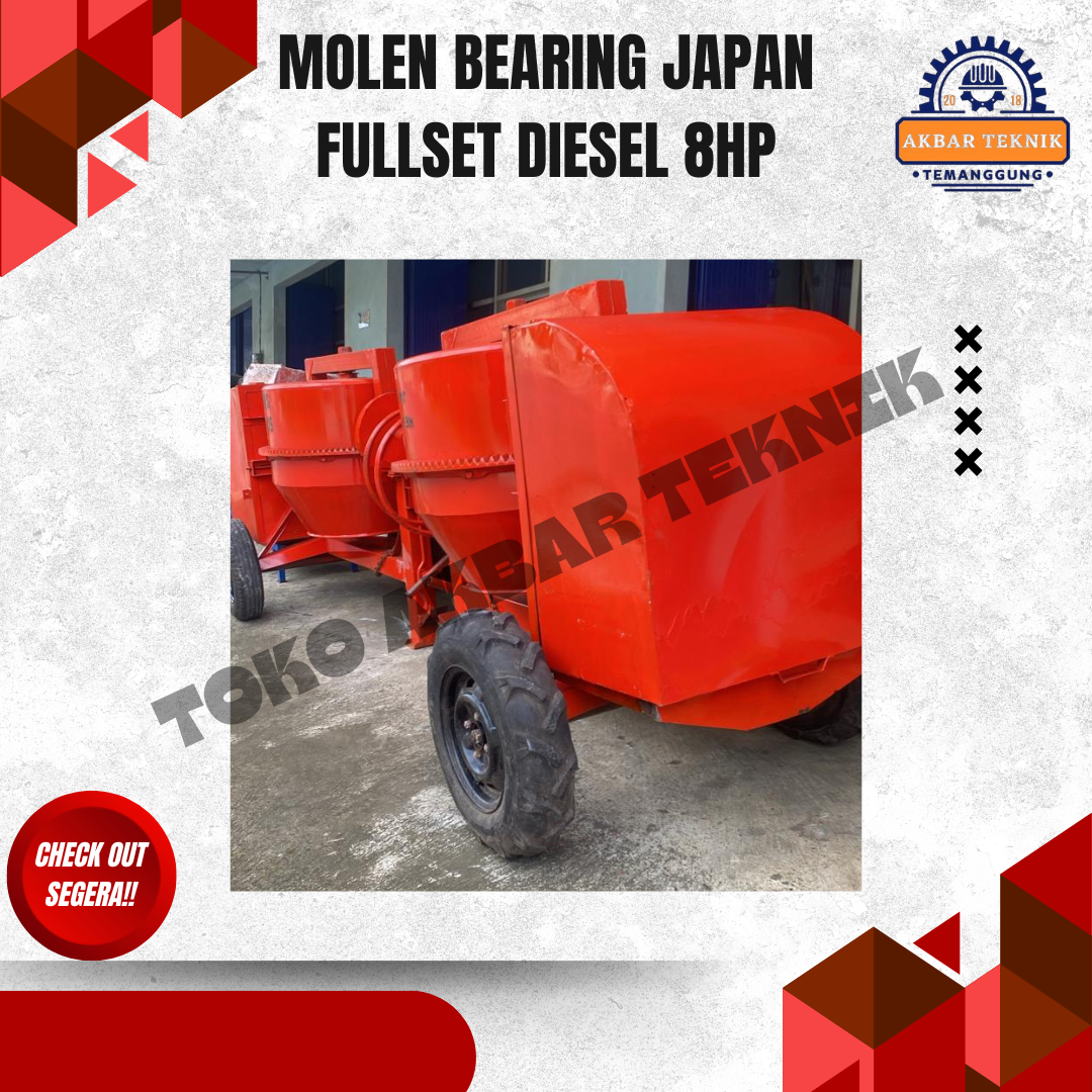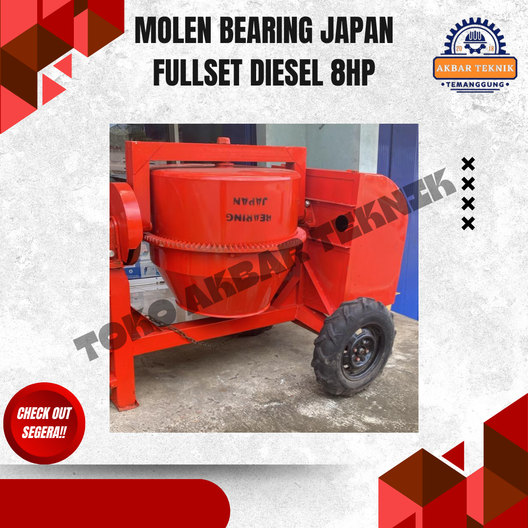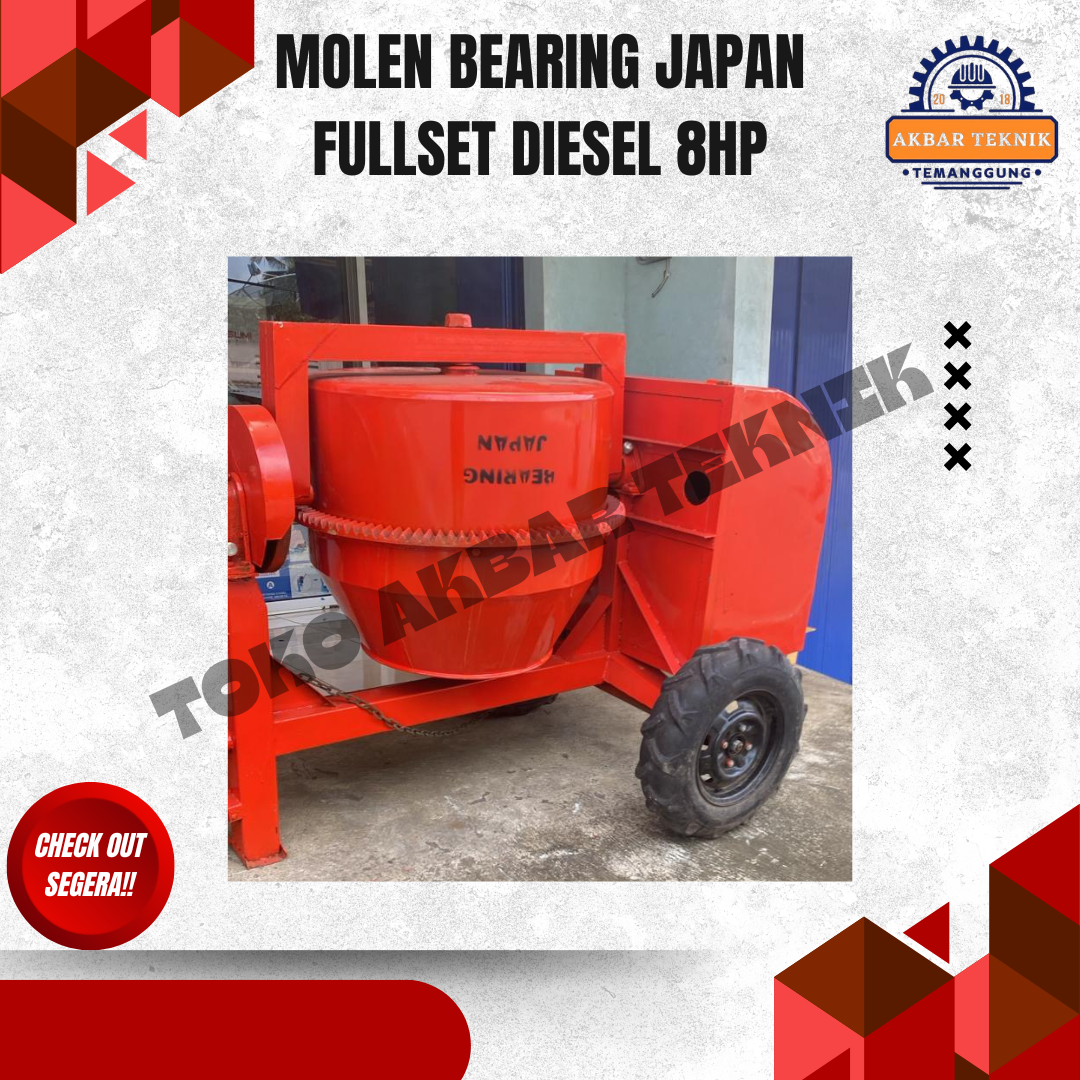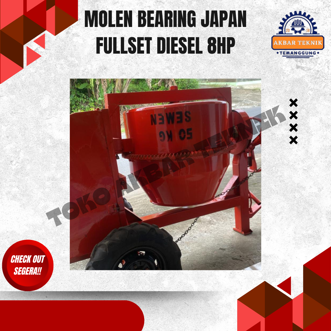DESKRIPSI PRODUK Molen Cor 50 Kg Fullset Diesel 8 HP adalah mesin pengaduk adukan beton yang dirancang untuk pekerjaan konstruksi skala kecil hingga menengah. Cocok digunakan untuk proyek bangunan rumah, renovasi, pengecoran jalan, talud, dan pekerjaan konstruksi lainnya. Menggunakan penggerak mesin diesel solar 8 HP, molen ini bertenaga kuat, irit bahan bakar, dan mampu bekerja stabil dalam waktu lama. Tabung molen dilengkapi bearing Japan yang membuat putaran lebih halus, awet, dan minim perawatan. Desain rangka kokoh dengan roda memudahkan pemindahan di area proyek. SPESIFIKASI TEKNIS Jenis: Molen Cor / Concrete Mixer Kapasitas Adukan: 50 Kg Penggerak: Mesin Diesel Solar Daya Mesin: 8 HP Sistem Starter: Engkol / starter diesel Sistem Putar: Gear ring + bearing Japan Bahan Tabung: Plat baja tebal Rangka: Besi baja kuat Mobilitas: Roda proyek (mudah dipindahkan) DIMENSI & BERAT (Perkiraan) Panjang: ± 140 – 150 cm Lebar: ± 90 – 100 cm Tinggi: ± 120 – 130 cm Berat mesin: ± 220 – 260 kg (fullset diesel) KEUNGGULAN Tenaga besar, cocok untuk kerja berat Mesin diesel irit dan tahan lama Bearing Japan, putaran halus dan awet Rangka kuat dan stabil Mudah dipindahkan di area proyek Cocok untuk tukang bangunan dan kontraktor APLIKASI PENGGUNAAN Pengecoran lantai dan pondasi Pembuatan sloof, kolom, dan balok Proyek bangunan rumah dan ruko Renovasi dan pekerjaan konstruksi harian