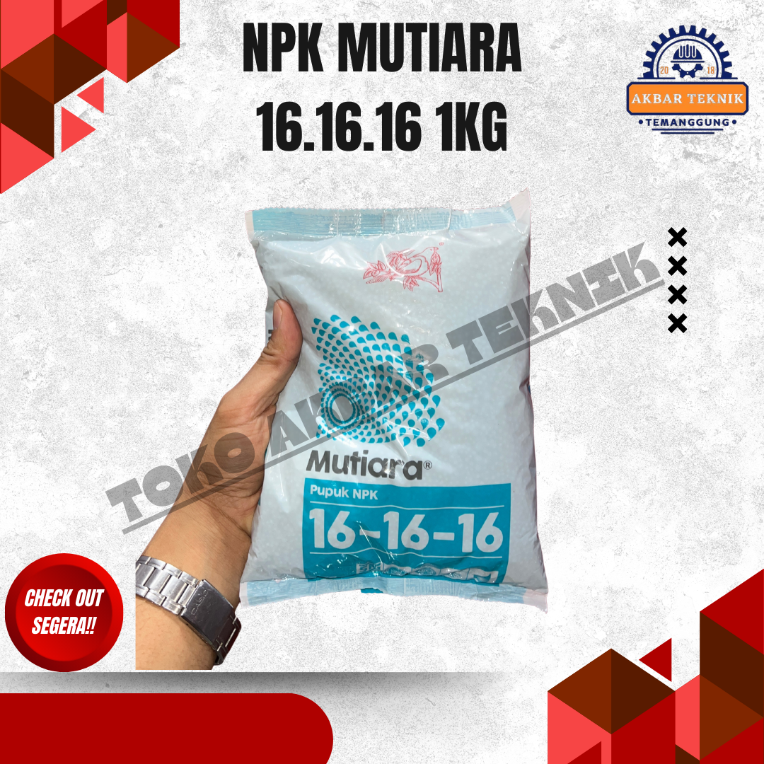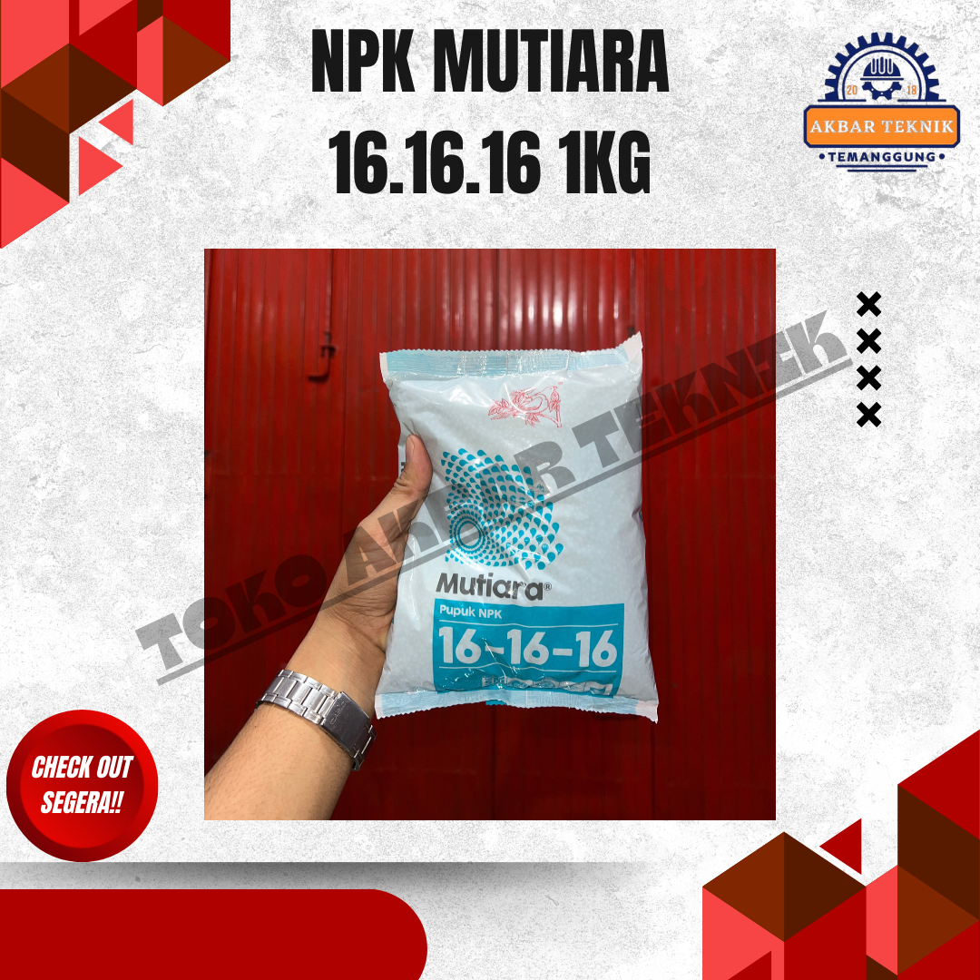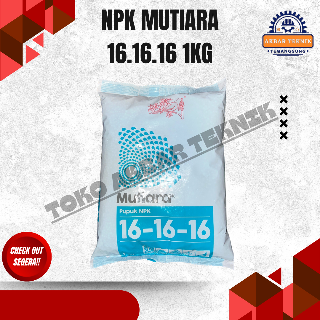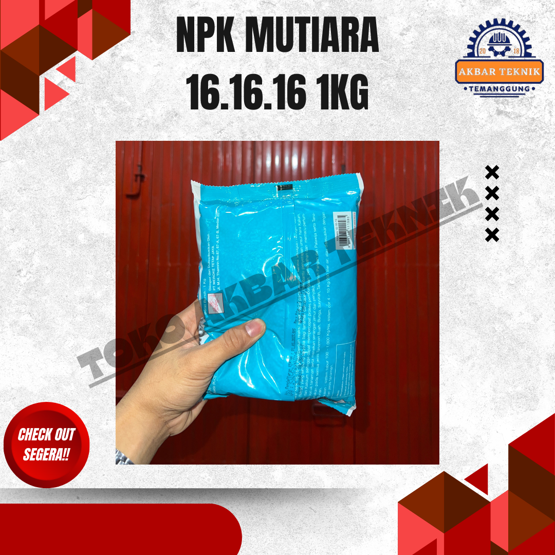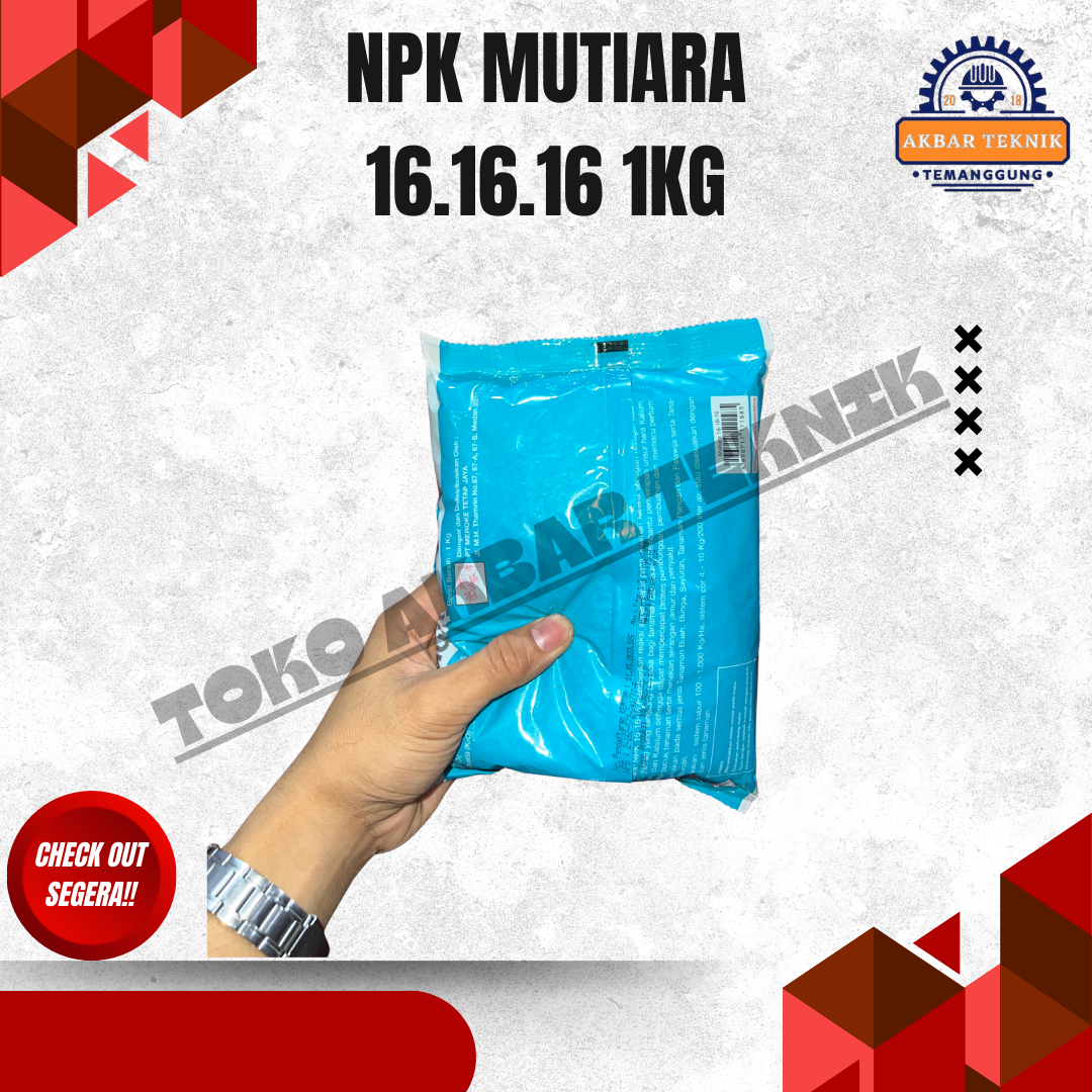 NPK Mutiara 16-16-16 (1 Kg) adalah pupuk majemuk berkualitas tinggi yang mengandung unsur hara makro seimbang Nitrogen (N), Fosfor (P), dan Kalium (K) masing masing 16 persen. Pupuk ini dirancang untuk mendukung pertumbuhan tanaman secara optimal mulai dari fase awal pertumbuhan hingga pembentukan hasil. Cocok digunakan untuk berbagai jenis tanaman pertanian, perkebunan, hortikultura, dan tanaman hias. Manfaat Utama Membantu pertumbuhan daun dan batang lebih hijau dan kuat Merangsang perkembangan akar yang sehat Meningkatkan pembungaan dan pembuahan Mendukung hasil panen lebih maksimal dan seragam Mudah larut dan cepat diserap tanaman Komposisi Kandungan Nitrogen : 16 persen Fosfor : 16 persen Kalium : 16 persen Cara Penggunaan dan Pemakaian 1. Tanaman Pangan (Padi, Jagung, Kedelai, dll) Dosis: 150–300 kg per hektar Aplikasi: Ditabur merata di sekitar tanaman Waktu pemupukan: Saat tanaman berumur 7–14 hari dan diulang sesuai kebutuhan tanaman 2. Tanaman Hortikultura (Cabai, Tomat, Sayuran, dll) Dosis: 1–2 sendok makan per tanaman Aplikasi: Ditabur melingkar dengan jarak 5–10 cm dari batang Frekuensi: Setiap 2–3 minggu 3. Tanaman Buah dan Perkebunan Tanaman muda: 50–100 gram per tanaman Tanaman dewasa: 200–500 gram per tanaman Aplikasi: Ditabur di sekitar tajuk tanaman lalu ditutup tanah Waktu: Awal musim hujan atau setelah penyiraman 4. Tanaman Hias Dosis: 1/2-1 sendok teh per pot Frekuensi: Setiap 2–4 minggu Aplikasi: Ditabur tipis dan disiram air Tips Pemakaian Lakukan penyiraman setelah pemupukan agar nutrisi cepat terserap Hindari kontak langsung pupuk dengan batang tanaman Gunakan sesuai dosis untuk hasil optimal
