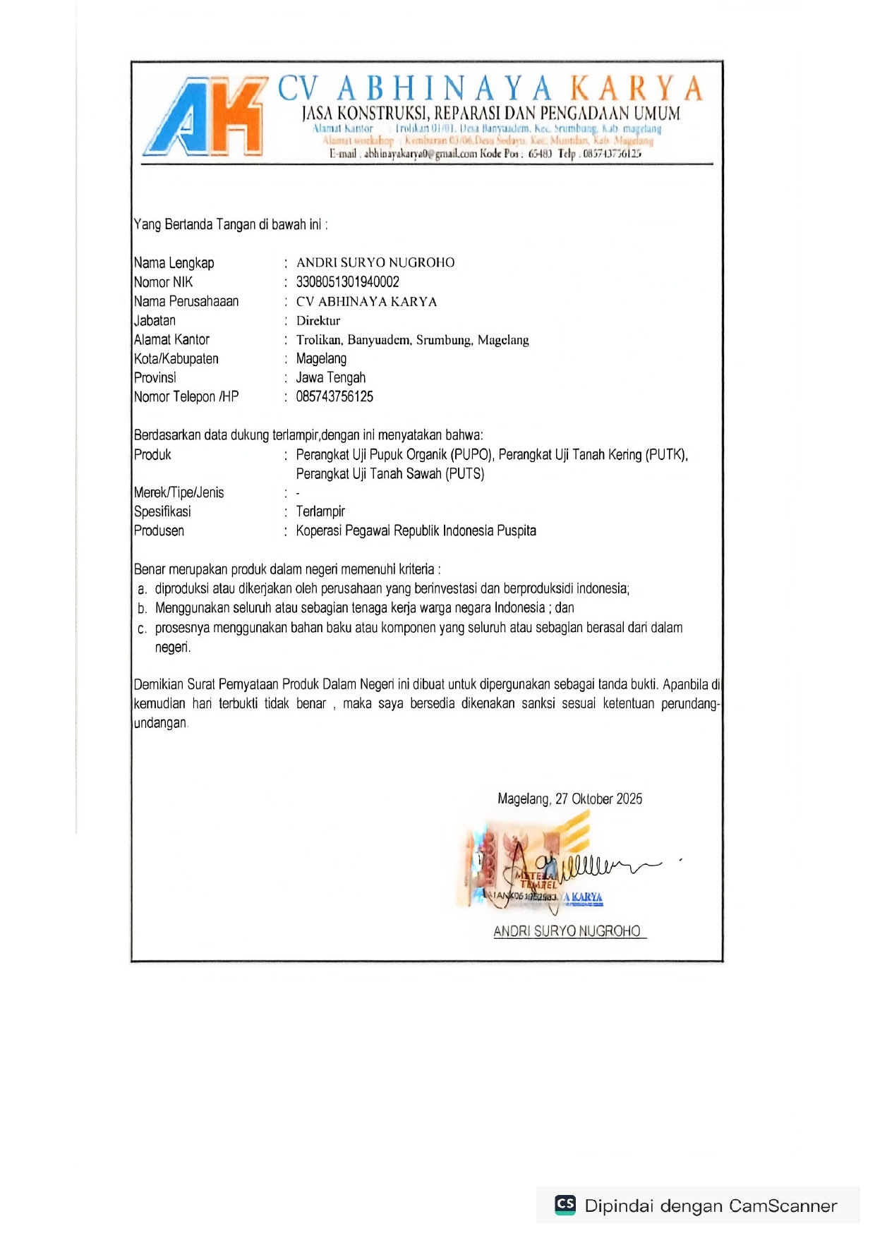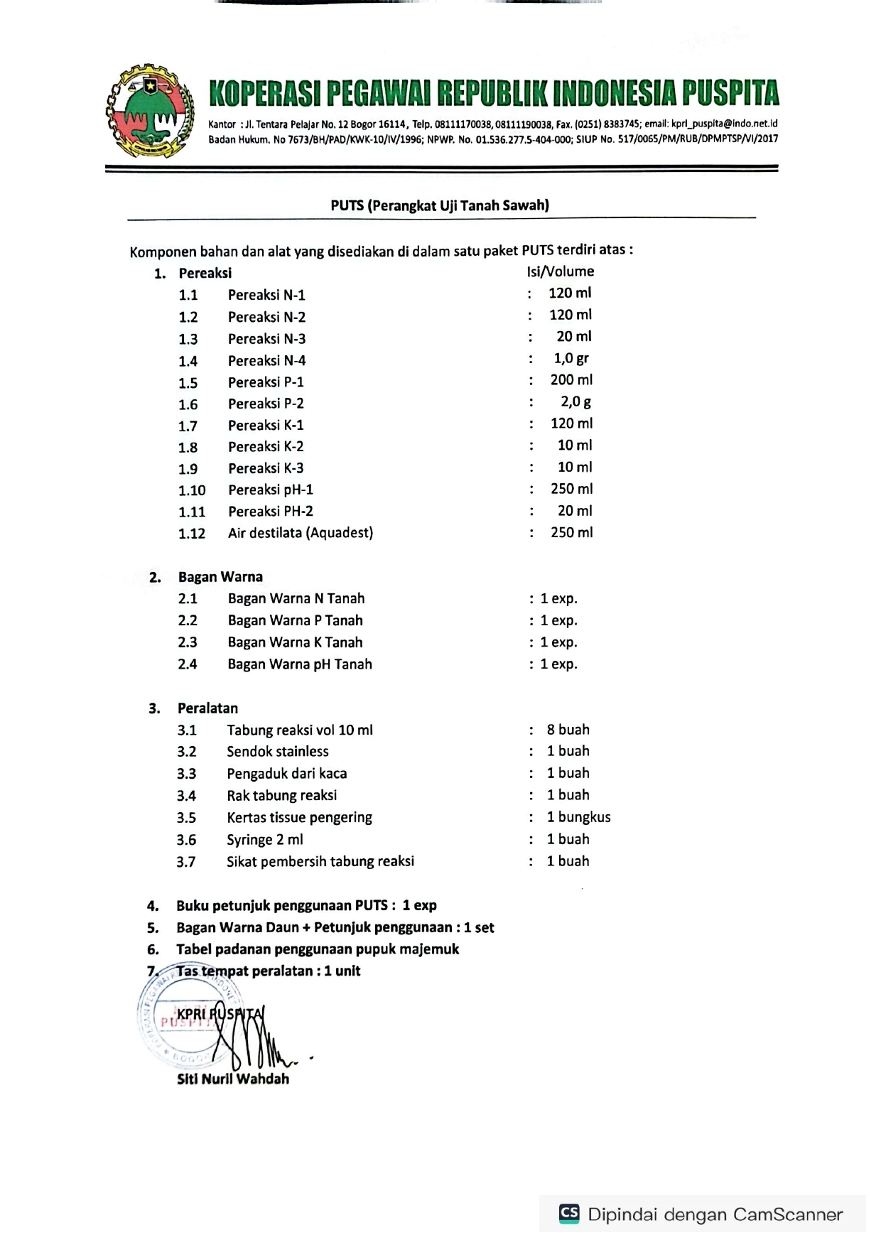 Perangkat Uji Tanah Sawah (PUTS) / Paddy Soils Test Kit merupakan suatu alat/cara untuk menganalisis/mengukur kadar unsur hara tanah seperti Kadar N, P, K dan pH Tanah. Kelebihan menggunakan alat ini yaitu relatif mudah, murah, dan cukup akurat. Perangkat Uji Tanah Sawah (PUTS) / Paddy Soils Test Kit terdiri dari : Pereaksi N-1 = 100 ml Pereaksi N-2 = 100 ml Pereaksi N-3 = 60 ml Pereaksi N-4 = 2, 5g Pereaksi P-1 = 250 ml Pereaksi P-2 = 2, 5 gr Pereaksi K-1 = 100 ml Pereaksi K-2 = 30 ml Pereaksi K-3 = 30 ml Pereaksi pH-1 = 250 ml Pereaksi pH-2 = 60 ml Air Murni ( Aquadest) : 250 ml Bagan Warna N tanah Bagan Warna P tanah Bagan Warna K tanah Terdapat buku panduan cara penggunaan puts harga perangkat uji tanah sawah perangkat uji tanah sawah pdf perangkat uji tanah kering puts perangkat uji tanah sawah perangkat uji tanah kering pdf cara penggunaan perangkat uji tanah sawah harga puts