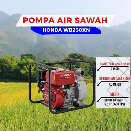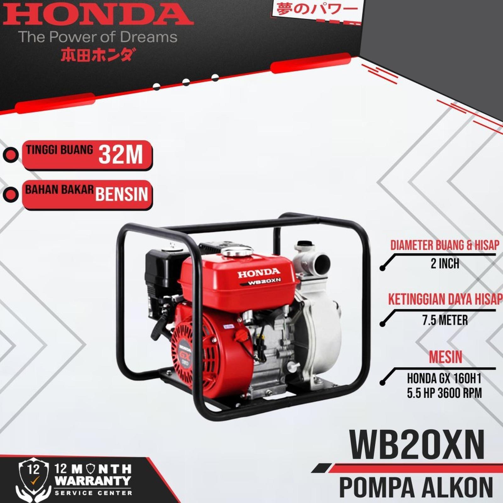 Sebagai salah satu pompa yang paling mengesankan diantara Pompa Honda, Volume Air yang dihasilkan oleh WB20XN telah dirancang sesuai dengan keinginan pelanggan, apa pun aplikasi yang anda ingin pakai. Mesin GX160 Honda 4-Stroke yang menggerakan WB20XN memastikannya mudah dihidupkan, mudah digunakan, hemat bahan bakar, emisi rendah dan daya tahan lebih lama. - Pompa Air 2 inch untuk Berbagai Kebutuhan - Mudah dihidupkan - Mesin Honda OHV - Irit Bahan Bakar - Bersertifikat SNI Spesifikasi : Tipe : Self priming, centrifugal pump Lubang Hisap : 50 mm ( 2 Inch ) Lubang Pengaliran : 50 mm ( 2 Inch ) Tinggi Total (Max.) : 32 m Tinggi Hisap (Max.) : 7.5 m Kapasitas Maksimum Pengairan : 670L/min Self feed time : 110 sec./ 5 m Dimensi : Panjang (mm) : 485 mm Lebar : 385 mm Tinggi : 405 mm Berat Kering : 24.15 kg Mesin Model : GX160H1 Tipe Mesin : 4-Tak, OHV silinder Tunggal, 250 Isi Silinder : 163 cm3 Diameter x Langkah : 68.0 x 45.0 mm Rasio Kompresi : 8.5 ± 0.3 Tenaga Bersih (SAE J1349)* 3.6kW (4.8 HP)/3600 min-1 rpm Torsi Maksimum (SAE J1349)* 10.3 N.m (1.05 kgf.m, 7.6 lbf.ft)/2500 min-1 rpm Konsumsi Bahan Bakar 1.4/h Kapasitas Tangki Bahan Bakar 3.1 Tipe Bahan Bakar Bensin Tanpa Timbal Kapasitas Oli 0.58 Saringan Udara Semi dry type