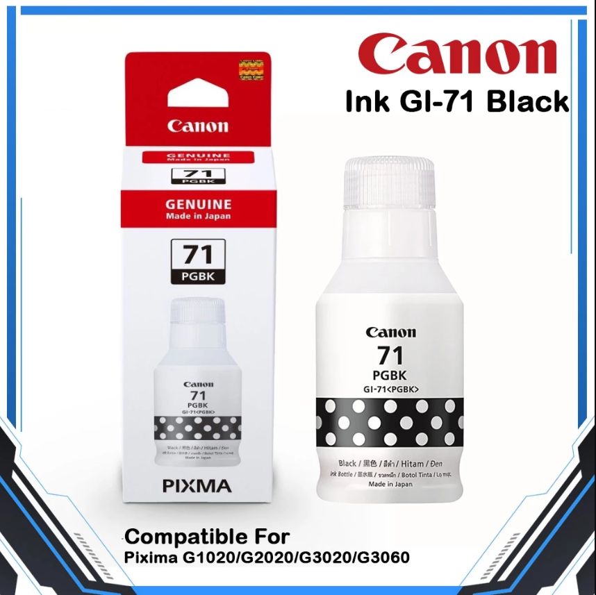 Harga pada link ini adalah harga per botol, 1 warna GI-71 black volume 135ml Untuk printer * Canon G series (G1020/G2020/G3020/G3060) * Canon G series (G1730/G1737/G2730/G2770/G3060/G3730/G3770/G4770)