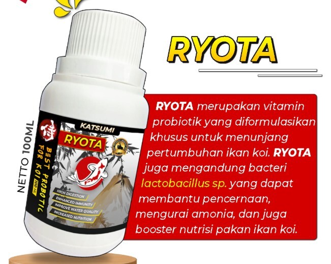 [RYOTA] Vitamin Probiotik Pakan Pelet Ikan Hias Koi Louhan Arwana Mas Koki Channa Chana Cupang Oscar RYOTA merupakan vitamin probiotik yang diformulasikan khusus untuk menunjang pertumbuhan dan kesehatan ikan koi dan ikan hias lainnya. RYOTA juga mengandung bacteri lactobacillus sp. yang dapat membantu pencernaan, mengurai amonia, dan juga booster nutrisi pakan ikan koi. Manfaat : - Meningkatkan nutrisi pakan - Meningkatkan pencernaan ikan - Meningkatkan kualitas air - Meningkatkan imunitas ikan Cara Pemberian: - Berikan setengah tutup pada 1 kg pelet. - Campur secara merata, diamkan selama 3-5 menit, siap digunakan. - Simpan sisa campuran di tempat tertutup dan jauhi sinar matahari. Netto : 100 ML